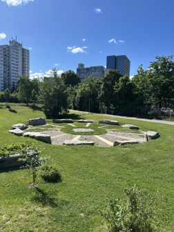 Fläche in qm: 650 Gründungsjahr: 2010 Gartenbeschreibung: "1 Bauwagen incl. Überdachung, 1 Waldwagen, 1 Kinderschaukel, Pflanzbeete zur gärtnerischen Nutzung, Baumstämme als Kletterspiel und Sitzgelegenheit, 2 Bienenstöcke, 1 Holzbackofen, Erstellung eines Steinkreis mit 13m Durchmesser. Der frei zugängliche Kreis bildet die Himmelsrichtungen, die Monate, ebenso astrologische und indianische Sternzeichen ab. Die Monate sind in verschiedenen Sprachen in die Steine eingraviert. Im Zentrum des Kreises befindet sich eine interaktive Sonnenuhr in einer Rosette dargestellt. Der Gemeinschaftsgarten ist öffentlich und wird von den Bewohner*innen des Stadtteils genutzt. Ziel: Naturbildung"